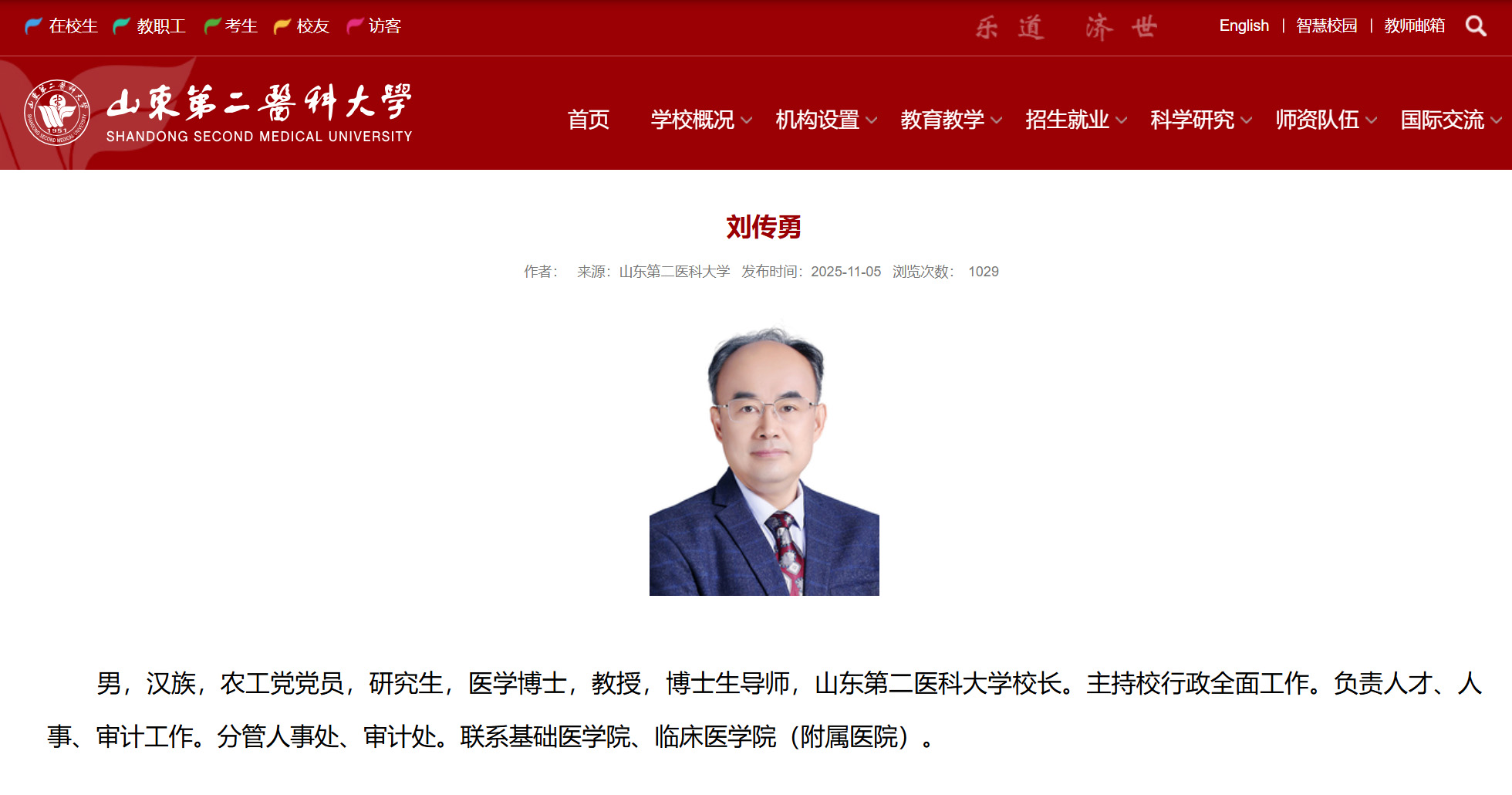 山东第二医科大学官网日前更新后显示,此前担任山东第一医科大学(省医学科学院)副校长(副院长)、农工党省委副主委的刘传勇已任山东第二医科大学校长,主持校行政全面工作。