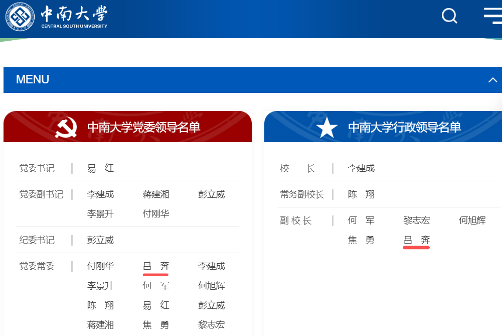 近日,中南大学官网“现任领导”一栏更新后显示,吕奔已任中南大学党委常委、副校长。