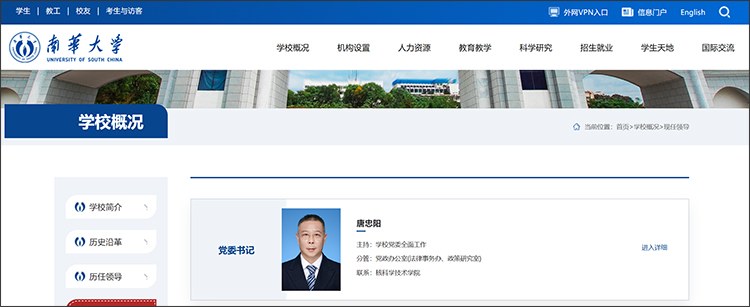 近日,南华大学官方网站“现任领导”一栏更新后显示,唐忠阳已任南华大学党委书记,主持学校党委全面工作。