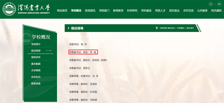 近日,沈阳农业大学官网“现任领导”栏目变更显示,李斌已任沈阳农业大学党委副书记、校长。公开报道显示,沈阳农业大学上一任校长为陈启军,于2018年初上任,2024年初卸任。此后,沈阳农业大学校长职务空缺至今。