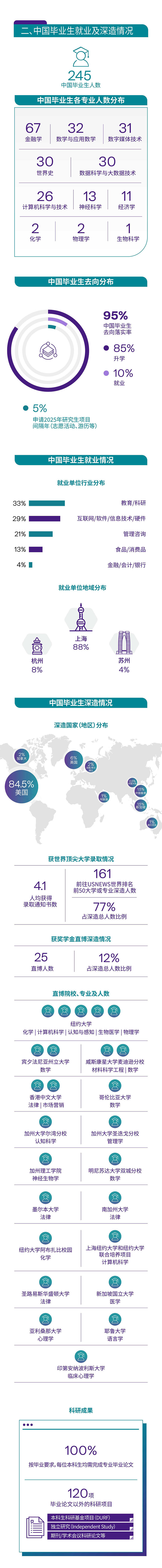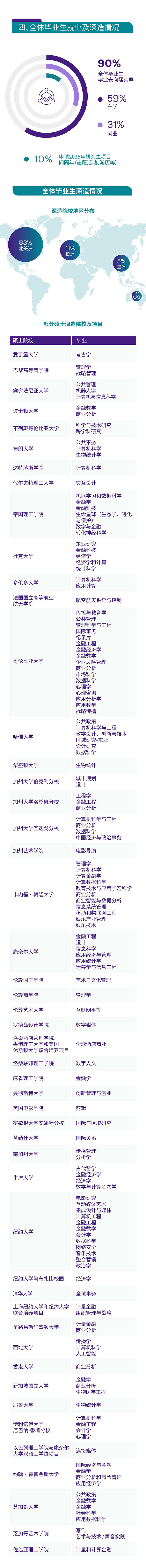 选择继续深造的毕业生进入全球顶尖硕博研究生项目。其中直博共计25人,人数再创历年新高。共有2人获全球知名奖学金,分别入选清华大学苏世民学者及富布赖特项目。