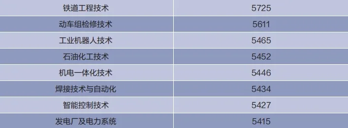 2023届高职专业月收入TOP10排行榜中,铁道类专业占据了前4名(铁道机车5833元、铁道交通运营管理5781元、铁道工程技术5725、动车组检修技术5611),基本与本科生平均月收入持平。