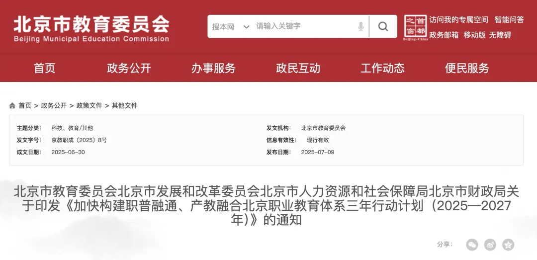 7月9日,北京市教育委员会网站发布《加快构建职普融通、产教融合北京职业教育体系三年行动计划(2025—2027年)》,其中明确提出:支持高水平高校与职业院校探索高职专科、职业本科、专业硕士贯通培养高水平技能人才。