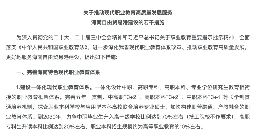 今年4月,海南省人民政府办公厅印发的《关于推动现代职业教育高质量发展服务海南自由贸易港建设的若干措施》中明确指出:建设一体化现代职业教育体系。一体化设计中职、高职专科、高职本科、专业学位研究生教育相衔接的职业教育框架体系。探索职业本科学校与应用型本科高校联合培养专业硕士。