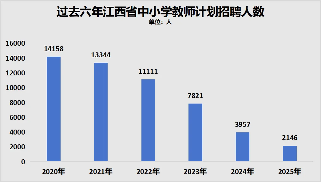 今年3月25日,江西省人力资源和社会保障厅官网披露:2025年江西省中小学教师招聘人数计划2146名。相比去年下降了45.8%,相比于2020年,则下降了84.8%。据统计,江西省教师招聘人数2020年达到近年来的高峰,之后一路下滑,过去三年下滑速度不断加快。