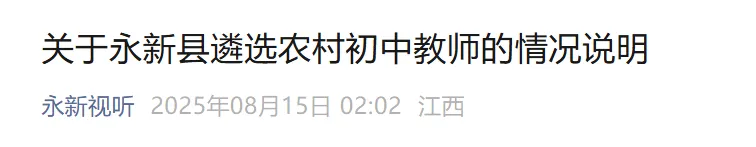 8月15日,江西永新县联合调查组通报:近日,我县遴选农村初中教师一事引发网友关注。对此,我县高度重视,立即成立调查组,进行调查核实,现将有关情况说明如下: