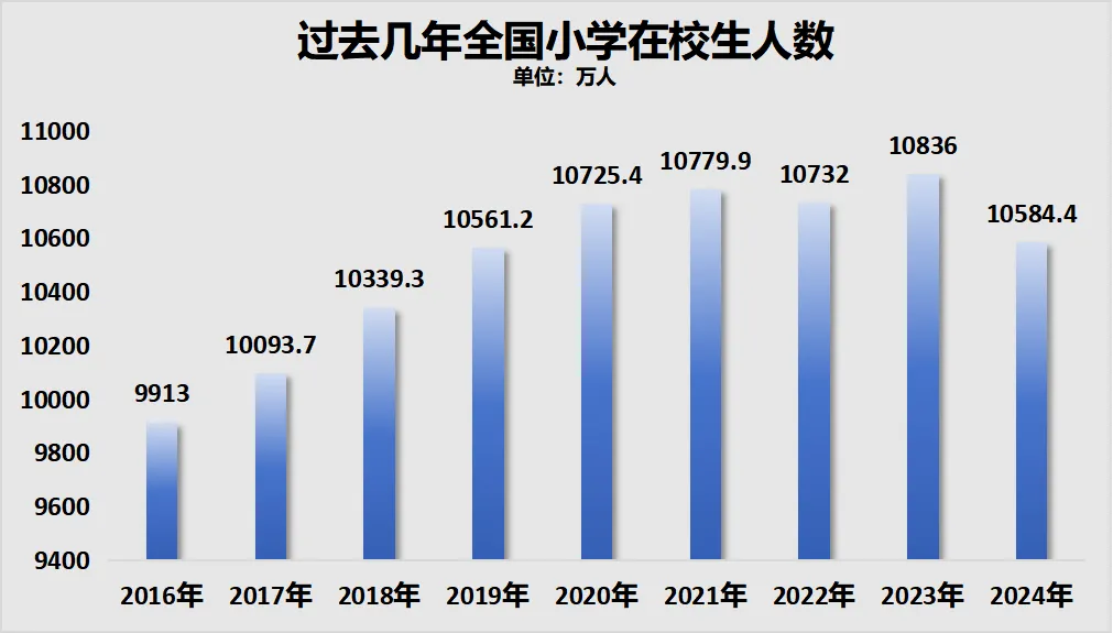 据教育部公布的数据显示,2022年,小学在校生人数迎来2014年以来的首次下降。2024年,全国小学招生1616.63万人,比上年减少261.25万人。