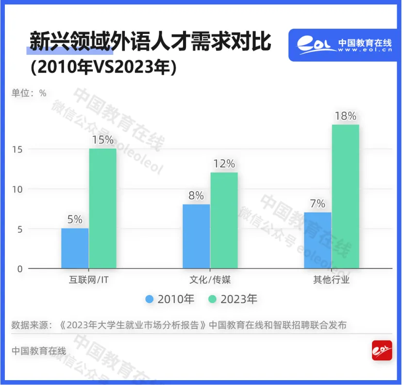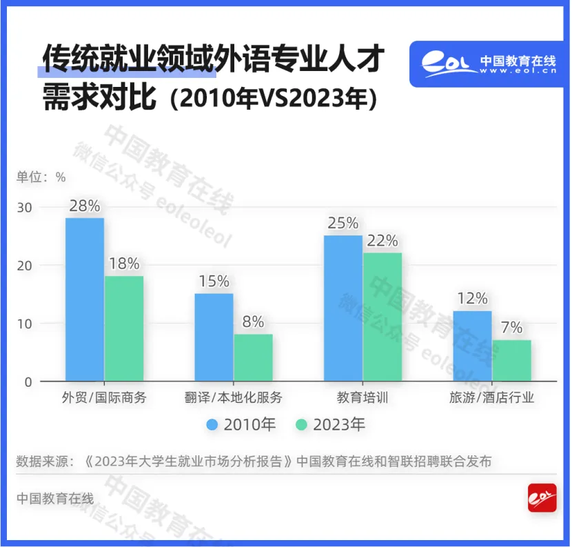 传统就业领域急剧萎缩。外贸/国际商务领域就业占比从2010年的28%降至2023年的18%;翻译/本地化服务领域从15%降至8%,几乎腰斩;教育培训领域从25%降至22%,K12英语培训更是断崖式下跌;旅游/酒店行业从12%降至7%。