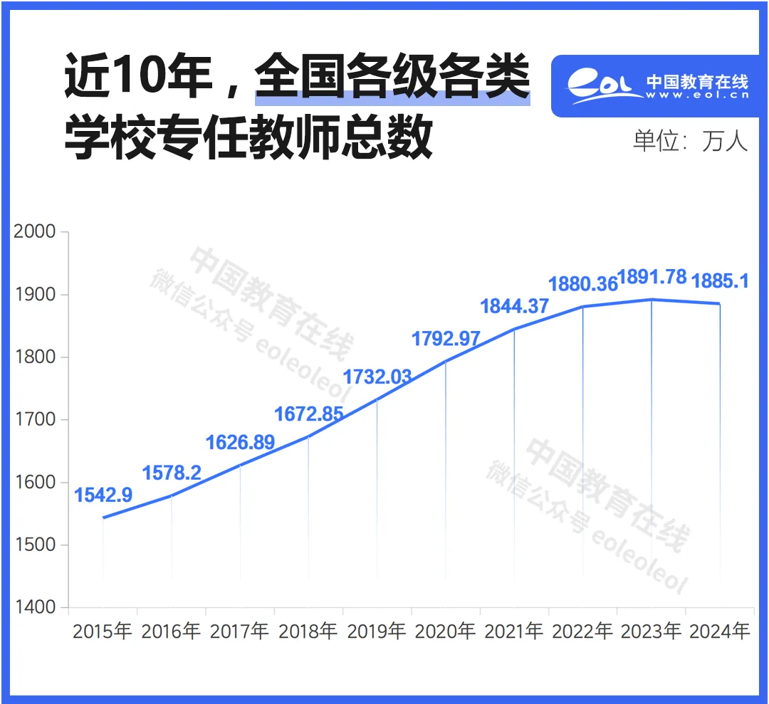 2024年,全国各级各类教师达1885.1万人,比2019年增加150多万人,比2015年增加340多万人。
