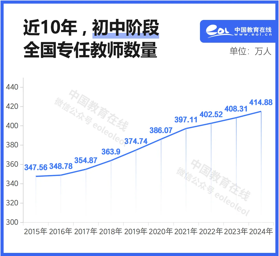 十年来,我国初中专任教师总数持续上涨。从2015年的347.56万,至2024年的414.88万,初中教师总数增加了67万人。