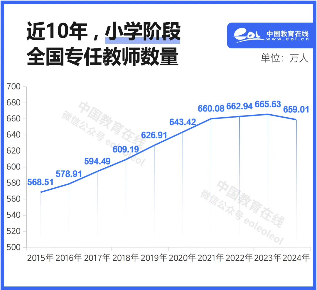 十年来,我国小学阶段专任教师总数稳定上涨。从2015年的568.51万,至2024年的659.01万,增加了90多万人。