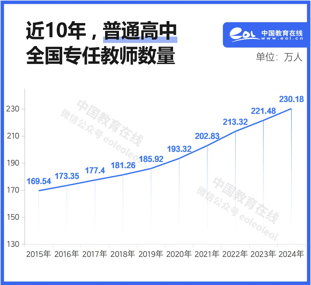 十年来,我国普通高中专任教师总数稳步上涨。从2015年的169.54万,至2024年的230.18万,普通高中教师增加了60多万人。