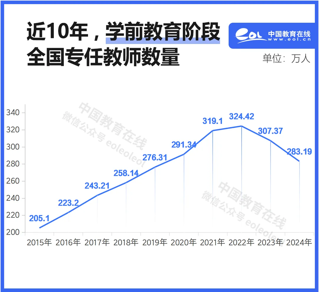 十年来,我国学前教育专任教师总数总体上升,但近两年起,教师数量下降趋势显现。相较2015年的205.10万,2024年学前教育教师数量增加近80万人。