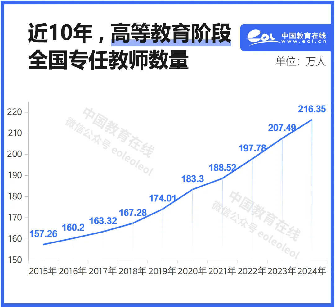 十年来,高等教育教师总数持续上涨。从2015年的157.26万,至2024年的216.35万,增加了近60万人。