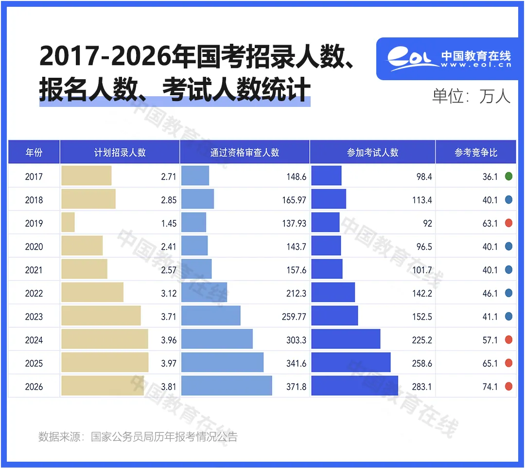 作为国内最具影响力的选拔类考试之一,国考的竞争难度始终是社会关注焦点。从十年前不足百万考生参考,到如今近300万人激烈角逐;从曾经“三四十选一”的竞争强度,到如今“七十四选一”的竞争态势,国考竞争激烈程度逐年攀升。