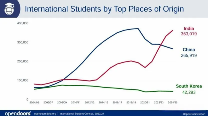 从全球看,留学规模仍在扩大。《2025年美国门户开放报告》显示,赴美留学生总数增长4.5%,达到117万人的历史高位。但与此同时,中国赴美留学生人数却下降至26.59 万人,连续5年下滑,与印度等国的差距进一步拉大。