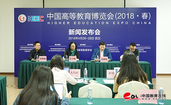 2018年4月25日,中国高等教育博览会(2018·春)(简称“高博会”)新闻发布会在武汉国际博览中心举行。中国高等教育学会副秘书长、本届高博会工作委员会副主任王小梅,中国高等教育学会事业发展部主任吴英策,北京大学实验室与设备管理部部长刘克新,高博会承办方国药励展展览有限责任公司副总经理英军,以及新华网、人民网、中国教育在线、央广网、中国网、新浪教育、湖北电视台教育频道、湖北卫视、长江日报、湖北日报、中新社、新浪湖北、腾讯、网易、搜狐、今日头条、荆楚网等17家新闻媒体出席本次新闻发布会。会议由吴英策主任主持。