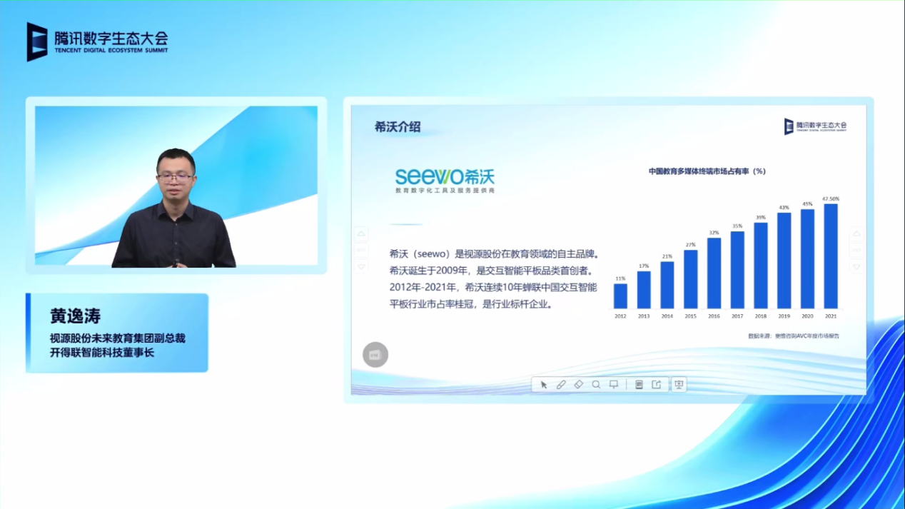 11月30日,2022年腾讯全球数字生态大会举办。视源股份未来教育集团副总裁、开得联智能科技董事长黄逸涛出席智慧教育专场,围绕视源股份在教育领域的自主品牌希沃,发表了《希沃助力教育数字化转型应用实践与未来探索》主题演讲。