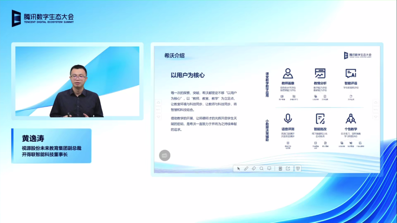 尊敬的各位领导嘉宾以及腾讯数字生态大会的伙伴们,大家下午好。我是来自视源股份的黄逸涛,今天很荣幸由我来跟大家做一个关于《希沃助力教育数字化转型应用实践与未来探索》的分享。