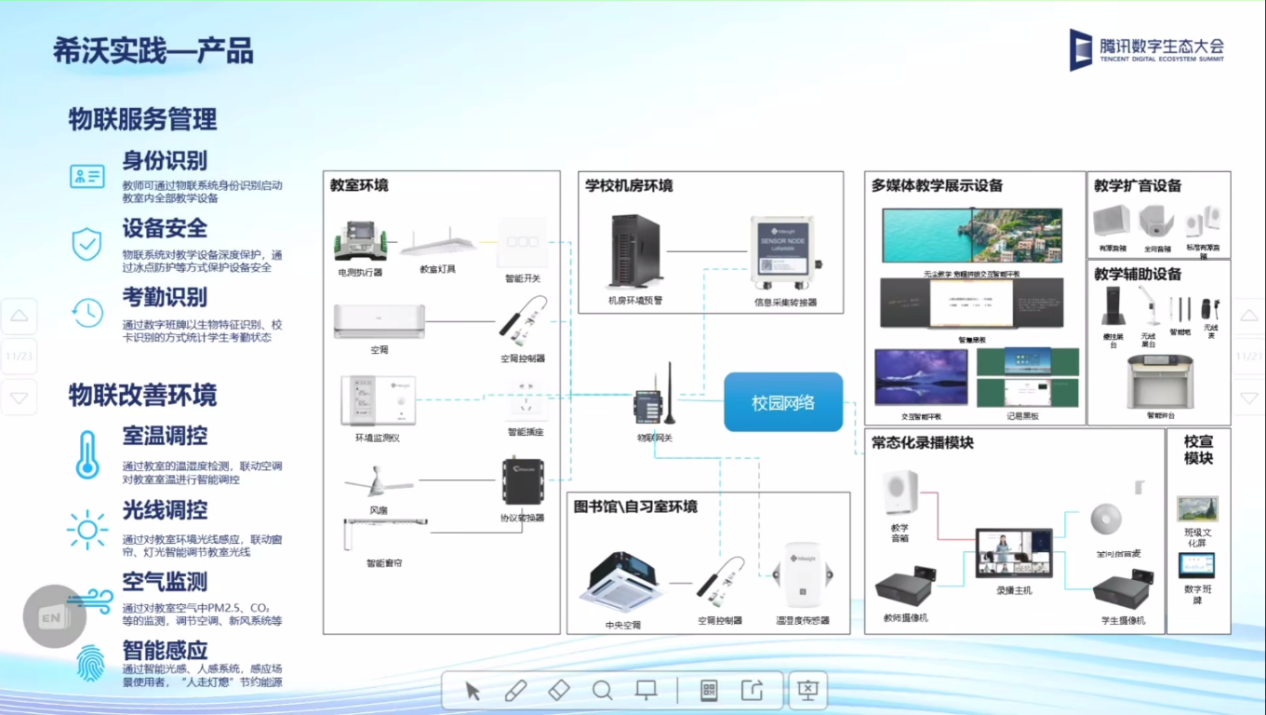 第四是面向双碳校园、绿色校园的物联管控、能源管控等相关的物联产品,能够实现人脸通行、身份识别、设备安全、考勤、室温调控、光线调控、空气监测、能耗管理等,共同助力绿色校园的建设。