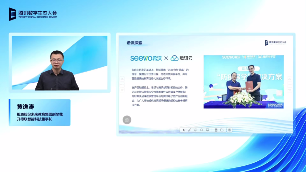 会上,黄逸涛主要从体系、产品、模式、平台、成果五个方面展示了希沃助力教育数字化发展的实践。其中,他特别介绍了希沃与腾讯在产品和服务上的紧密合作。腾讯云为希沃提供安全可靠的弹性云计算及存储服务,同时希沃品课教学管理平台与腾讯电子签产品创新融合,为广大高校提供疫情期间便捷的返校信息申报解决方案。