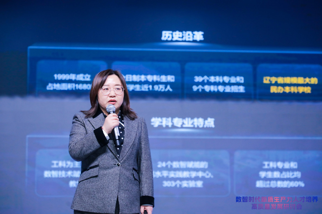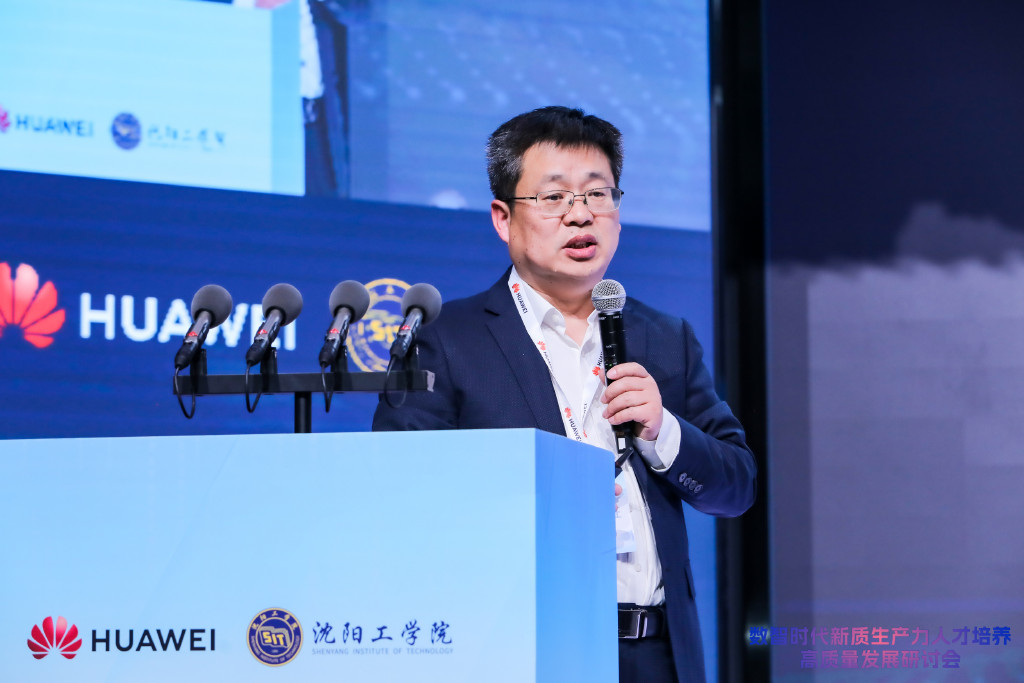 在主题分享环节,沈阳工学院教务处处长杨玥发表了题为“数智时代背景下新质生产力人才培养的探究”的演讲。她指出:“人工智能发展已从局部探索走向千行百业,这一趋势对高等教育提出了更高要求。在此背景下,沈阳工学院深化校企合作,通过携手华为构建‘协同进化’的新模式,并学习企业运营模式,旨在推动教学平台建设和管理流程赋能,从而实现高质量发展和学生高质量就业的目标,以满足未来产业发展需求。”