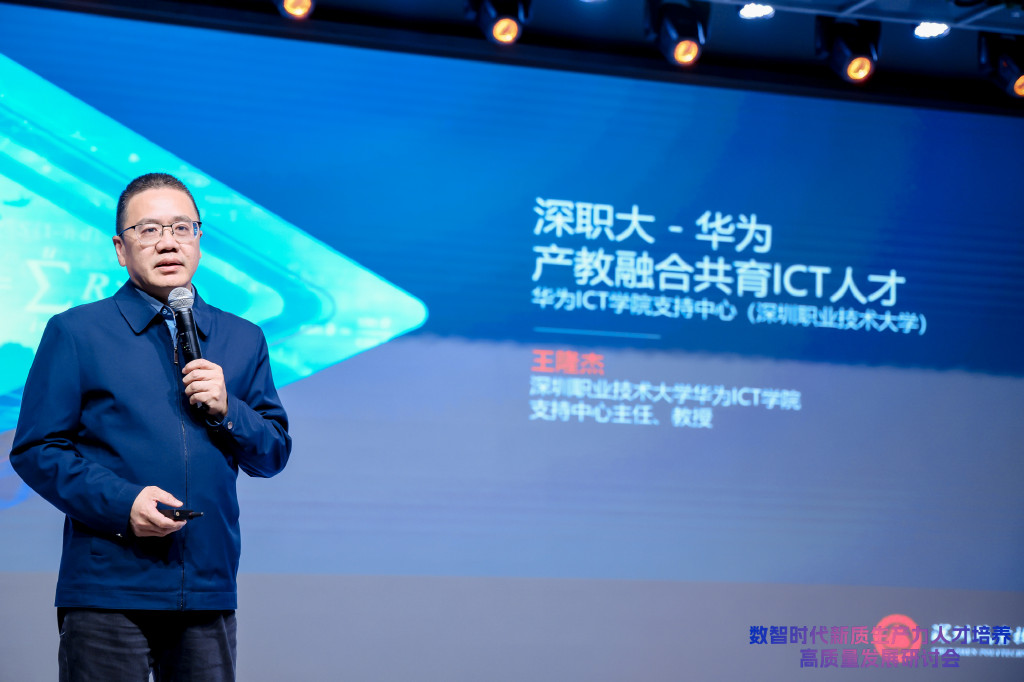 深圳职业技术大学华为ICT学院支持中心主任王隆杰在“深职大-华为产教融合共育ICT人才”主题演讲中,回顾了学院与华为的合作历程,并对双方的合作成果进行了介绍。340名在校生通过华为HCIE认证。这些数据不仅体现了人才培养的成效,也验证了“课证共生共长”理论。围绕培养高端应用型人才的办学理念,呼吁各方凝练经验、复制成功案例,共同推动ICT教育的全球化发展。