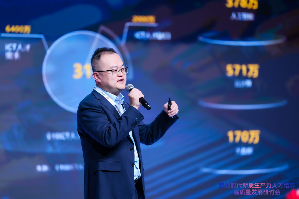 华为中国政企教育医疗系统部教育科研业务总经理阮东闽也发表了“助力ICT人才培养,共赢教育行业智能化”的主题演讲。他提到,未来人工智能行业渗透率达到20%,ICT人才缺口也将达到2000万,华为围绕“人工智能+教育”,华为打造全场景1+3解决方案,包括覆盖120多个国家的ICT学院和数字化实训平台,每年培养200,000多名学生。新的“根智融合”生成式人工智能数字实训解决方案,也将加速培养高技能AI人才与AI+X行业应用人才,助力各行业数智化落地。