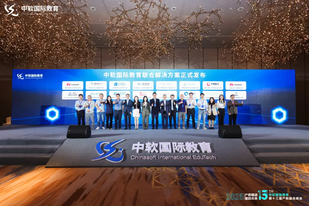 现场,中软国际教育科技集团卓越研究院副院长周海联合华为、强脑科技、乐聚机器人、美林数据、润开鸿、泛太科技、云圣智能、飞渡科技、麒麟软件、华鲲振宇、量旋科技、理工比特林克、华智创科、智汇云舟、算能科技等16家生态伙伴企业代表共同发布了中软国际教育联合解决方案,围绕大模型、脑机接口、具身智能、开源鸿蒙、无人机、AI视觉、AI4S、集成电路、工业互联网、数字孪生等方向,展示了产教融合领域的最新技术与应用成果。