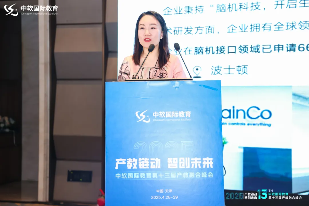 强脑科技高级副总裁杨承君围绕“脑机接口高校教育与应用创新探索”做了主题报告并现场演示结合脑机接口和AI算法的智能仿生手。杨承君介绍,BrainCo强脑科技创立于2015年,是首家入选哈佛大学创新实验室(Harvard Innovation Lab)的中国团队,也是全球非侵入式脑机接口技术领军企业。企业秉持“脑机科技,开启生命更多可能性”的使命,成立十年来致力于将实验室里的技术应用于现实,带来真实世界的影响。她指出,脑机行业作为新质生产力代表性产业,受到国家重点关注,同时相关企业在技术创新和产业升级过程中对拔尖人才的需求也日益紧迫。强脑科技携手中软国际教育科技集团,依托双方资源及技术优势,与院校进行深度融合,以脑机接口+人工智能+X专业模式,促进产学研协同发展,助力高质量复合型人才培养,赋能千行万业。