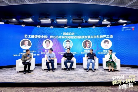 在未来教育跨界研究者、《新职力》《超级AI与未来教育》作者李骏翼的主持下,大连艺术学院人工智能专业负责人杨磊博士、慧科教育集团副总裁李祺、数美科技高级副总裁周秋野以及长扬科技教育事业部总经理李昊为参与了“艺工融铸安全盾:民办艺术院校网络空间新质发展与学科破界之道”圆桌论坛。各位嘉宾围绕如何将人工智能、计算机、网络空间安全等专业有机融入艺术高等教育发展,促进跨学科人才培养等议题展开深入讨论。