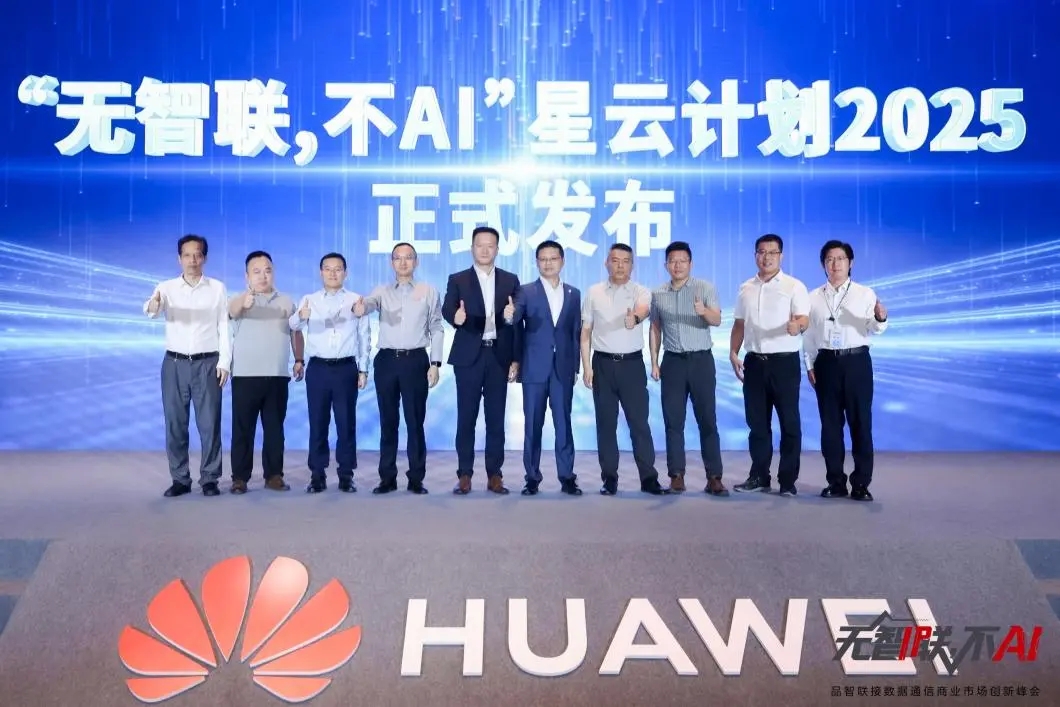 随后,华为企业业务MKT副总裁郁赛华、华为数据通信产品线首席营销官殷玉楼、华为深圳政企业务副总经理刘贵、华为深圳政企数通解决方案销售部部长罗涛、华为深圳政企伙伴与商业销售部总经理王克、深圳市今天国际物流技术股份有限公司企业管理中心总经理严雨华、深圳市聚迅科技有限公司董事长陶超、索尔集团股份有限公司董事长彭伟高及深圳市星华时代科技有限公司董事长米庆华等嘉宾共同登台,与华为中国政企商业MKT与解决方案销售部部长浦强一起发布了《“无智联,不AI”星云计划2025》。
