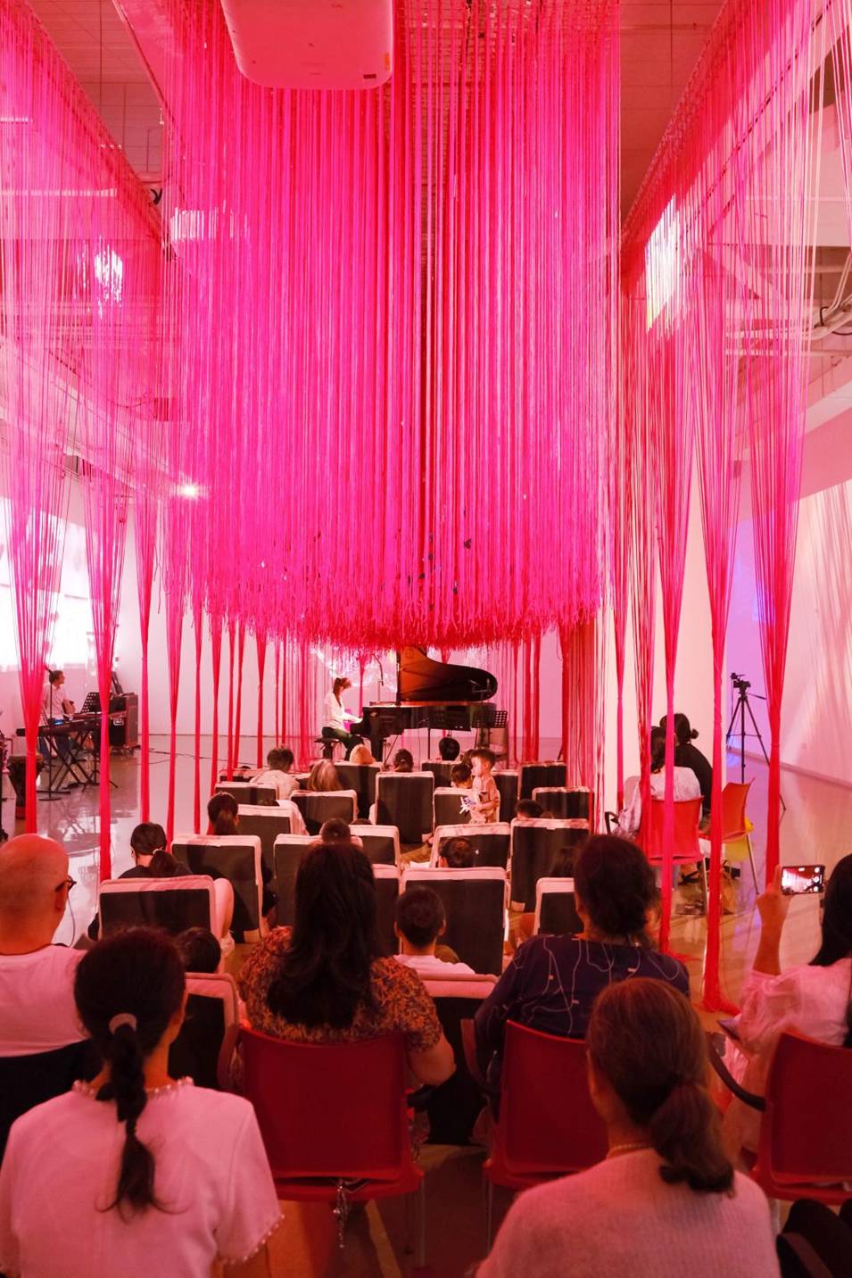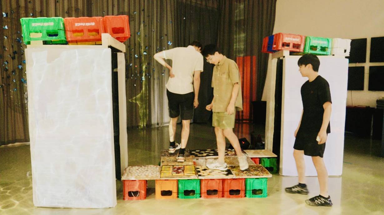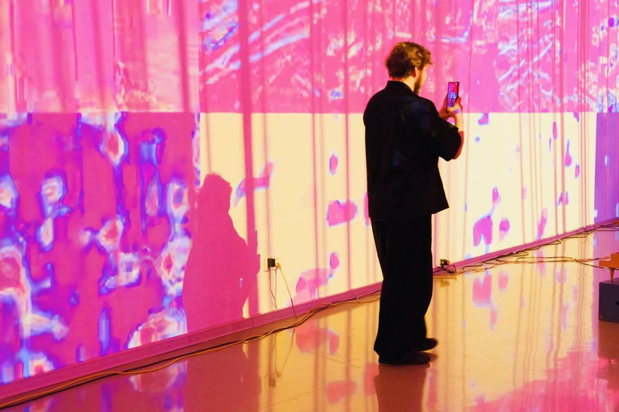 学员们的创造力远不止于传统舞台。现场,15岁的学员Nathaniel Frank带来了极具先锋性的装置艺术与观众参与作品《Accelerometer》。他坦言其核心理念是“将艺术掌控权移交给观众”——现场观众通过一种独特而直观的交互方式,直接成为音乐的创作者。装置艺术的探索同样令人瞩目。17岁的学员宁盛康(Moses Ning)的《蝴蝶桥》构建了一个融合光影与声音的互动空间,观众的行为将影响装置的形态与声效,象征着不同文化、代际间的连接。而蔡祎欣(Angela Cai)则以科学视角切入,创作了两部作品:装置《Ballade of the Microscopic》利用舞蹈动作操控合成生命体的进化过程,以及结合脑电波与江南丝竹元素的表演作品《神经竹韵:电脑图与电子音乐》。Nathaniel、Moses与Angela三人均为雅各布·查尔斯(Jacob Charles)指导的学生,专注于当代作曲、电脑音乐与互动视觉艺术的跨领域探索。