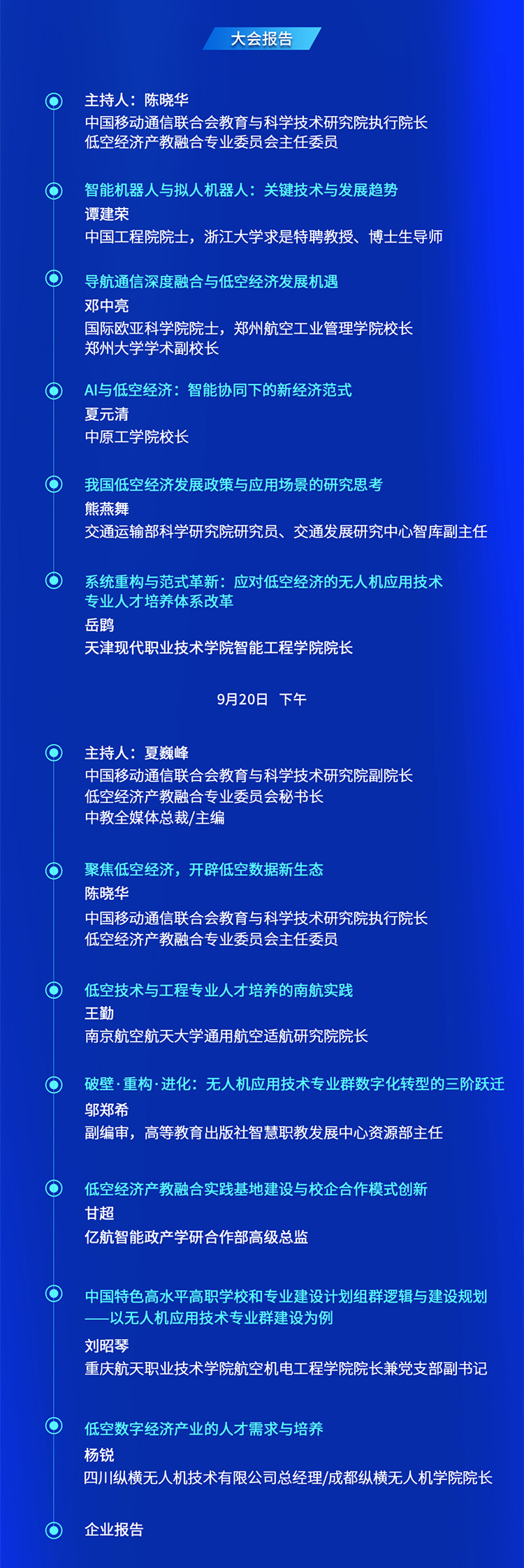 大会将邀请教育部、工信部、交通运输部等部委领导以及院士、专家、学者等深入解读低空经济最新政策,分析行业发展趋势。中国工程院院士,浙江大学求是特聘教授、博士生导师谭建荣将围绕“智能机器人与拟人机器人:关键技术与发展趋势”做出主旨报告;国际欧亚科学院院士,郑州航空工业管理学院校长,郑州大学学术副校长邓中亮将围绕“导航通信深度融合与低空经济发展机遇”做出深度解读;交通运输部科学研究院研究员、交通发展研究中心智库副主任熊燕舞将分享"我国低空经济发展政策与应用场景的研究思考";中原工学院校长夏元清将围绕“AI与低空经济:智能协同下的新经济范式”做出深刻解读,为产教融合指明方向。