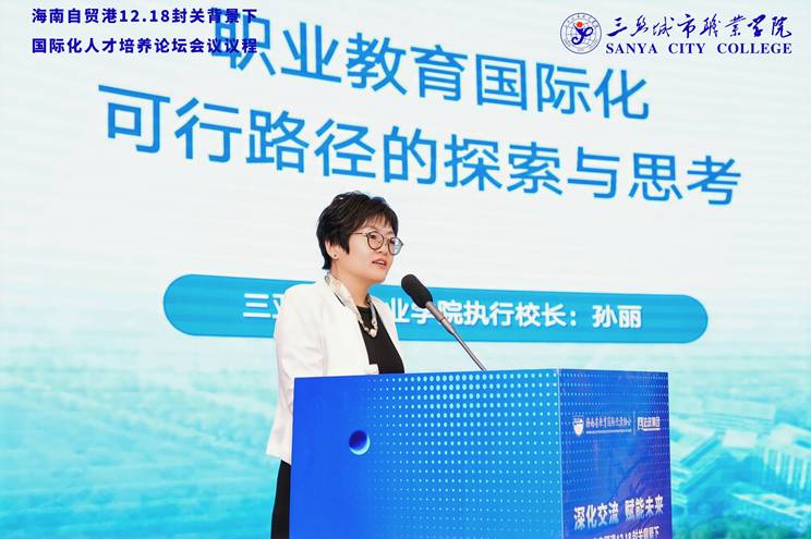 三亚城市职业学院执行校长孙丽以“职业教育国际化可行路径的探索与思考”为题,介绍了三亚城市职业学院“六业贯通”办学生态与沉浸式语言教学、国际课程引入等实践举措。