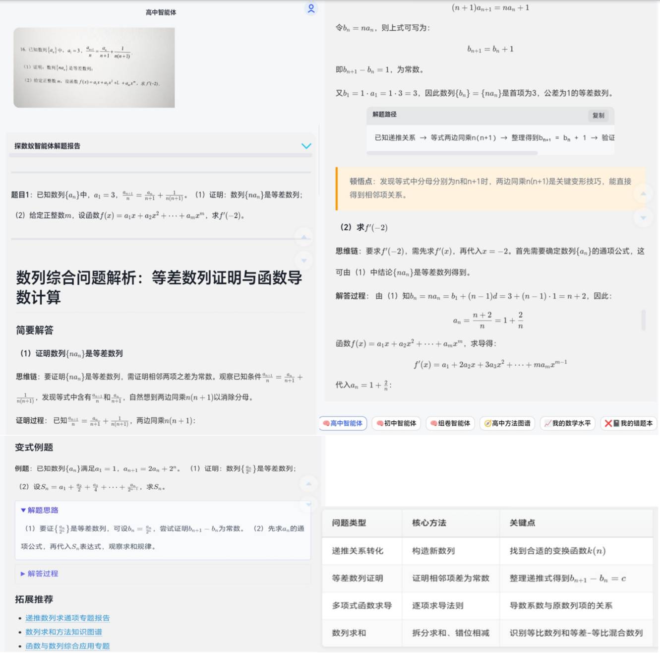 教育数字化转型持续深化,AI技术与基础教育的融合已成为推动教育高质量发展的重要引擎,在初高中数学教学场景中,AI学习工具已逐步成为学生提升数学能力的重要辅助载体。然而许多产品仍局限于工具化浅层应用,仅提供搜题、刷题、答案推送等基础服务,沦为“答案搬运工”与“习题推送器”,未能触及数学学习的核心——逻辑构建、思维培养与能力迁移。长期依赖此类工具,不仅无法帮助学生真正学透数学知识,还可能导致学生逐渐丧失独立思考能力。在此背景下,探数蚁数学智能体跳出传统“工具思维”,以9大核心功能模块为支撑,将AI技术与初高中数学学习规律深度融合,聚焦思维培育核心,为学生、家长提供了一套系统化的数学提升方案,为初高中数学教学赋能提供了新路径。