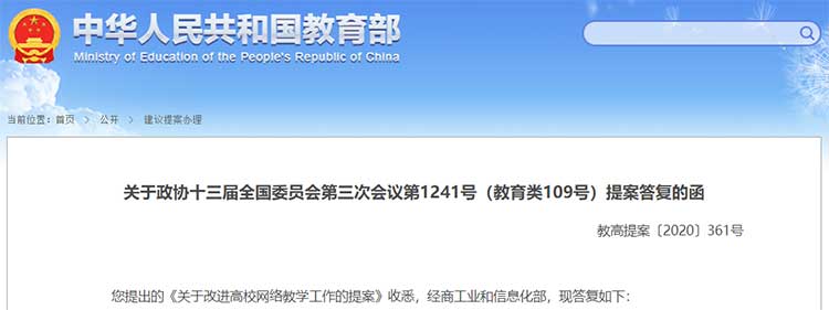 1月25日,教育部在关于政协十三届全国委员会第三次会议第1241号(教育类109号)提案答复的函中指出,当前,运用互联网、人工智能等现代信息技术进行教与学互动的新型教育方式已经成为教育服务的重要组成部分。新冠肺炎疫情期间,教育部指导各地教育行政部门和高校组织广大师生开展了一场前所未有的大规模在线教学实践,主动应对停教、停学危机带来的挑战,探索了在线教学的新范式,积累了大量弥足珍贵的经验,明确了未来教育教学改革的方向。教育部将以这次大规模线上教学为契机,促进信息技术与教育教学的深度融合,推动在线教学从“新鲜感”向“新常态”转变。