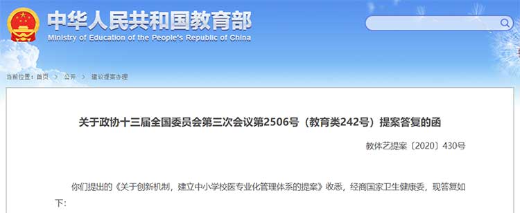 教育部在关于政协十三届全国委员会第三次会议第2506号(教育类242号)提案答复的函中指出,配齐配强校医对于开展学校卫生工作、保障师生健康非常重要。近年来,教育部会同有关部门,要求各级教育部门和学校依据《学校卫生工作条例》和《国家学校体育卫生条件试行基本标准》等规定,设立校医务室或卫生室,配备合格的校医或专(兼)职保健教师。教育部也将积极开展试点研究,探索校医定向委培招生培养工作、全科医学教育人才培养、医疗机构派驻、政府购买校医服务等多种渠道和策略,以解决专业校医配备问题。