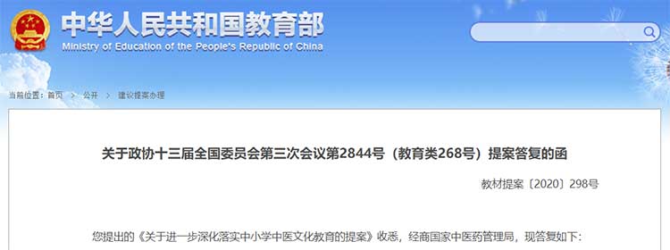 12月7日,教育部网站发布对《关于进一步深化落实中小学中医文化教育的提案》的答复。答复中称,教育部一直高度重视中医药文化教育,将中医药文化教育作为中华优秀传统文化教育的重要内容,结合不同年龄段学生认知发展特点,有机融入中小学道德与法治、历史、语文、体育与健康等相关课程教材和校园文化活动之中。