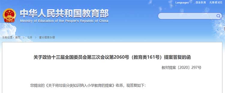 12月7日,教育部网站发布对《关于减少各类“进校园”活动的提案》的答复。答复中指出,教育部高度重视在中小学开展和落实环境保护教育和生态文明教育,增强学生的环境保护意识,树立正确的生态文明观。下一步,教育部将继续加强垃圾分类教育,在相关课程教材中进一步丰富学习内容;不断创新教育形式,着力提高生活垃圾处理教育的针对性和有效性,提升广大青少年学生的环保意识和能力。