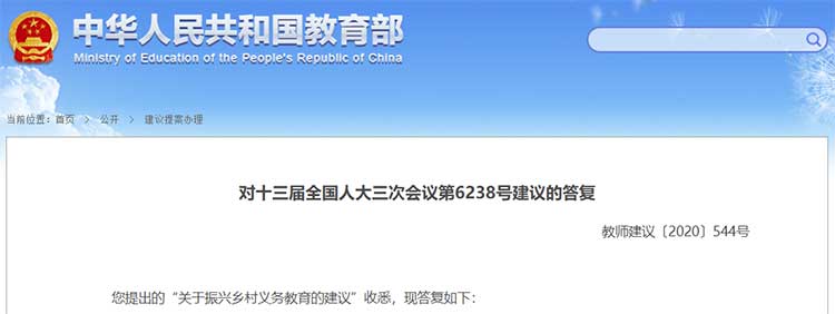 12月15日,教育部对《关于振兴乡村义务教育的建议》做出回应。答复中表示,党中央、国务院高度重视教师队伍建设。2015年,国办出台《乡村教师支持计划(2015-2020年)》,制定一系列政策措施,支持和引导地方不断加强乡村教师队伍建设,乡村教师队伍整体面貌明显改观。2020年8月,教育部等六部门印发《关于加强新时代乡村教师队伍建设的意见》(以下简称《意见》),谋划新时期乡村教师队伍建设,着力底部抬高,补足乡村教师短板,为推进脱贫攻坚与乡村振兴有效衔接提供师资力量。