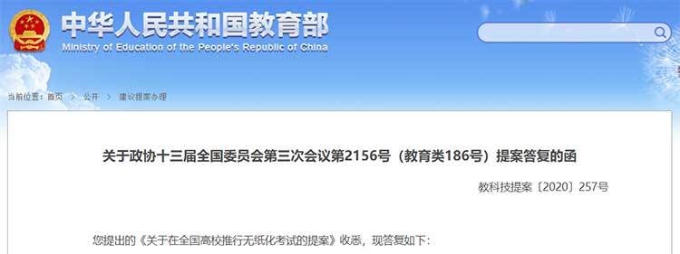 教育部在关于政协十三届全国委员会第三次会议第2156号(教育类186号)提案答复的函中指出,推进高校无纸化考试,具有节约资源、简化流程、过程严密等优点,对于提高考试的科学性、公平性具有积极的意义。下一步,教育部将继续推进深化新时代教育评价改革工作,引导、鼓励高校积极探索无纸化考试应用,宣传推广先进经验。