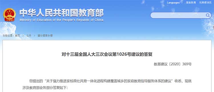 12月2日,教育部在对“关于强力推进家校政社共育一体化进程构建覆盖城乡的家庭教育指导服务体系的建议”答复中表示,教育部将进一步加强家庭教育工作,不断完善政策措施,提升家庭教育水平。一是会同妇联等有关部门,继续加强政策指导,宣传推广家庭教育科学理念,帮助家长掌握科学的育儿知识,推动形成全社会关注家庭教育的良好氛围。二是继续支持具备条件的高校依法设置家庭教育相关专业,加强相关课程建设,加强家庭教育相关领域高层次人才培养。三是会同财政部等部门,继续加强家庭教育工作,强化家庭教育经费保障,推动形成政府主导、部门协作、家长参与、学校组织、社会支持的家庭教育工作格局。