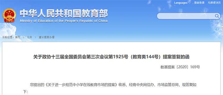 12月2日,教育部网站发布对《关于进一步规范中小学在线教育市场的提案》的答复。近年来在线教育迅猛发展,在为学生提供服务的同时,也出现了超标超前培训、虚假宣传、培训人员素质参差不齐、存在低俗有害信息等问题,备受各方关注。答复中称,教育部一直高度重视规范在线教育工作,以规范面向中小学生的学科类校外线上培训机构(以下简称线上机构)为突破口,加强与中央网信办、公安部等部门的沟通配合,采取了一系列举措,规范在线教育有序发展。