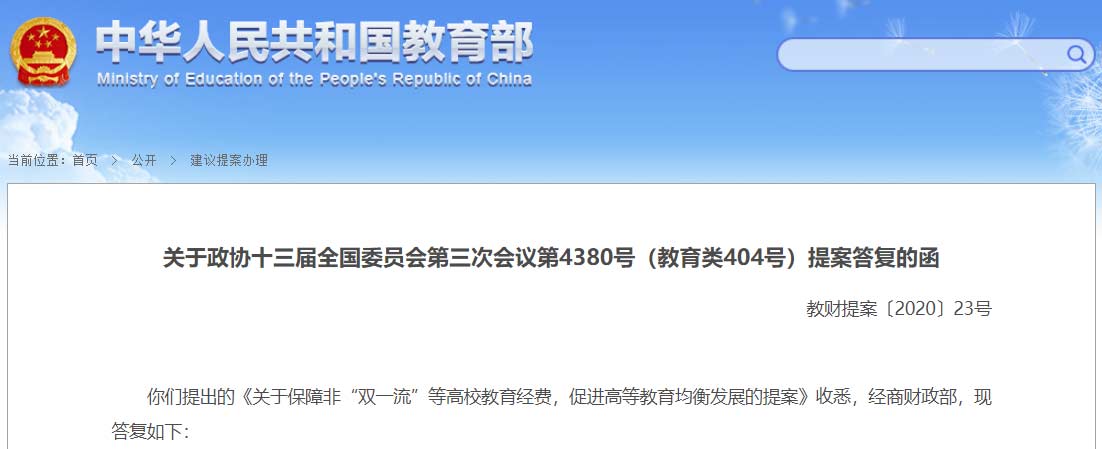 你们提出的《关于保障非“双一流”等高校教育经费,促进高等教育均衡发展的提案》收悉,经商财政部,现答复如下: