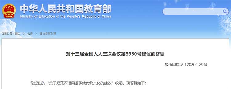 您提出的“关于规范汉语用语承续传统文化的建议”收悉,现答复如下: