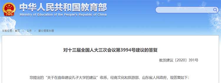 11月13日,教育部对“关于在曲阜建设孔子大学的建议”做出答复。《答复》中指出,关于在曲阜建设孔子大学的问题,须纳入山东省高校设置规划统筹研究论证。山东曲阜有着悠久的历史文化传统和丰富的文化教育资源,建议曲阜师范大学、尼山世界儒学中心等汇聚国内外儒学研究力量,在学术研究、交流推广、国际合作、人才培养等方面加大工作力度,加强对传统文化研究,培养优秀传统文化人才,传承弘扬优秀传统文化,推动中华优秀传统文化融合创新发展。
