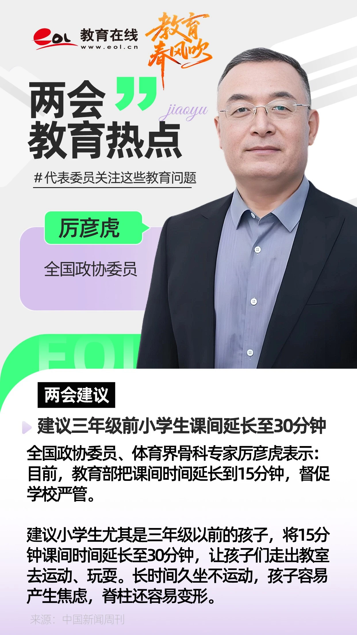 厉彦虎:建议三年级前小学生课间延长至30分钟