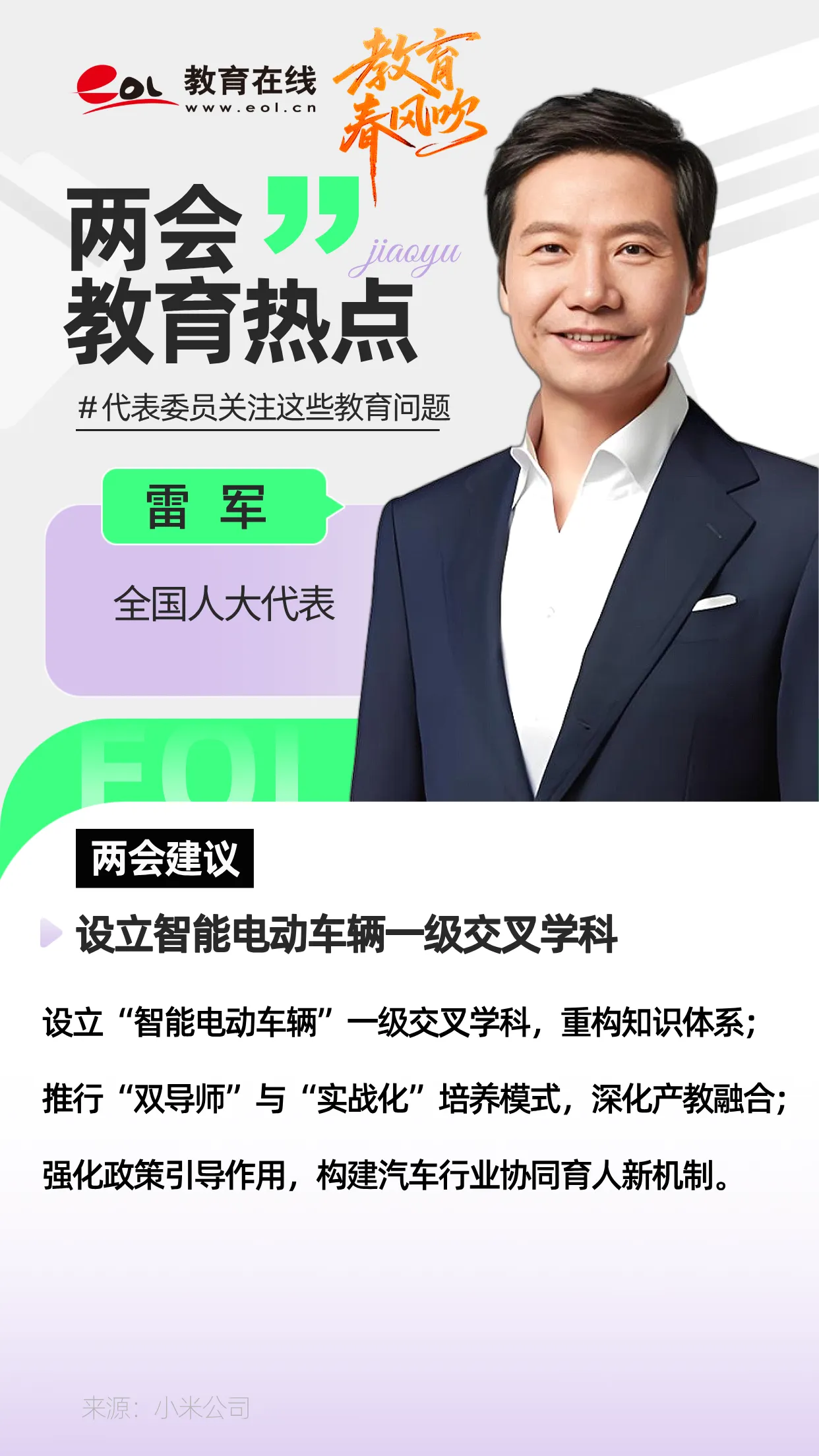 雷军:建议设立“智能电动车辆”一级交叉学科