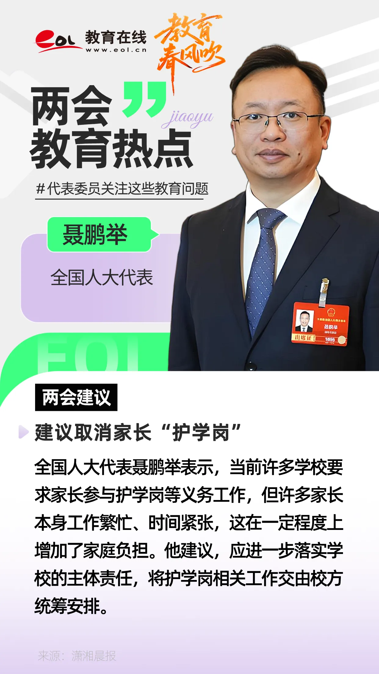 全国人大代表聂鹏举表示,很多学校要求家长到校参与护学岗等义务工作,给家庭造成负担,建议取消护学岗,学校要落实主体机制。